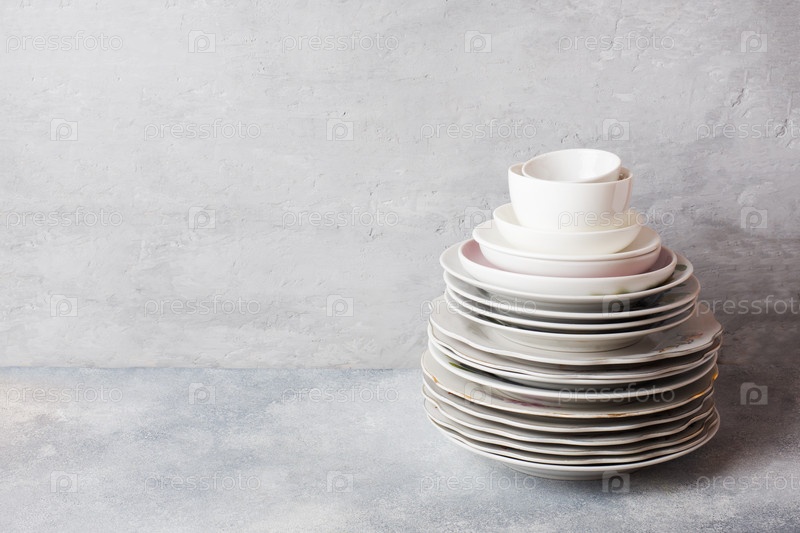 Стопка пустых чистых тарелок на сером столе с местом для копирования