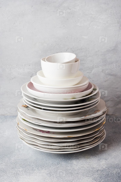 Стопка пустых чистых тарелок на сером столе с местом для копирования