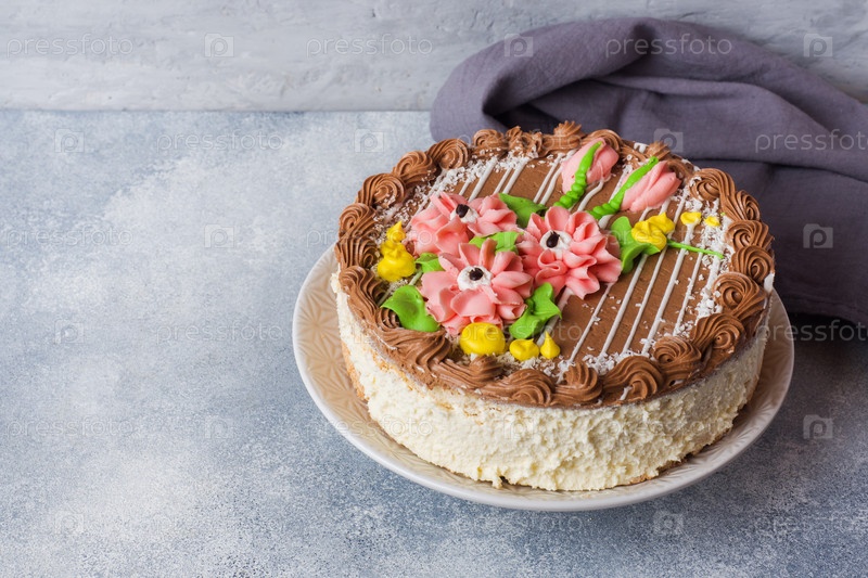 Красивый безе-торт, украшенный кремовыми розами. Кондитерский бизнес в сфере сладостей. Копировальное пространство