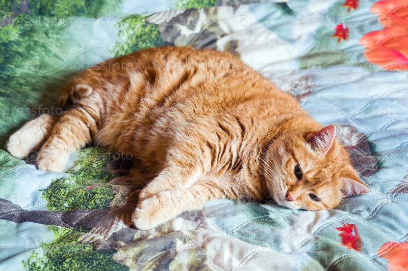 Рыжий кот годами лежит на кровати в одеяле. Уютный дом и концепция отдыха