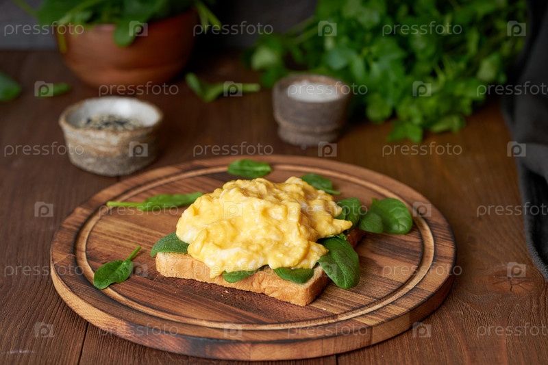 Тост с яичницей и шпинатом. Омлет. Завтрак с жареными на сковороде яйцами на коричневом