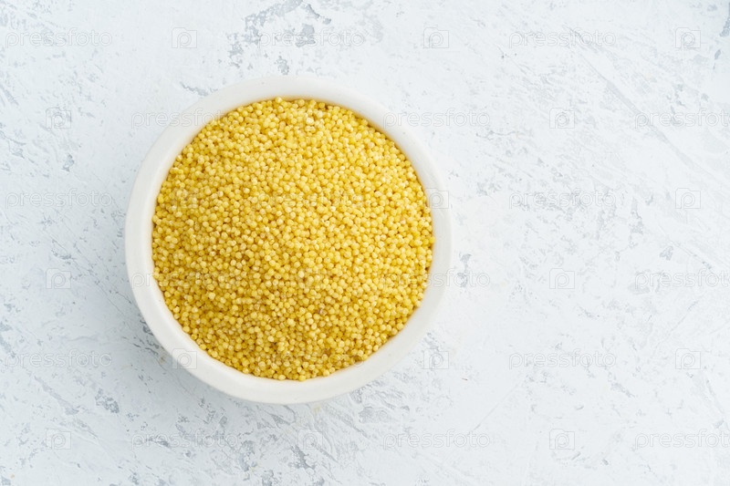 Просо, камыш в белой миске на белом фоне. Без лектина, сушеные хлопья в чашке, веганская еда