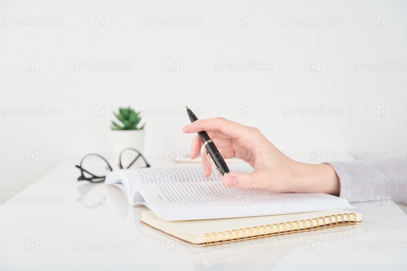 Женщина пишет в блокноте, концепция офисной работы на фоне белой стены