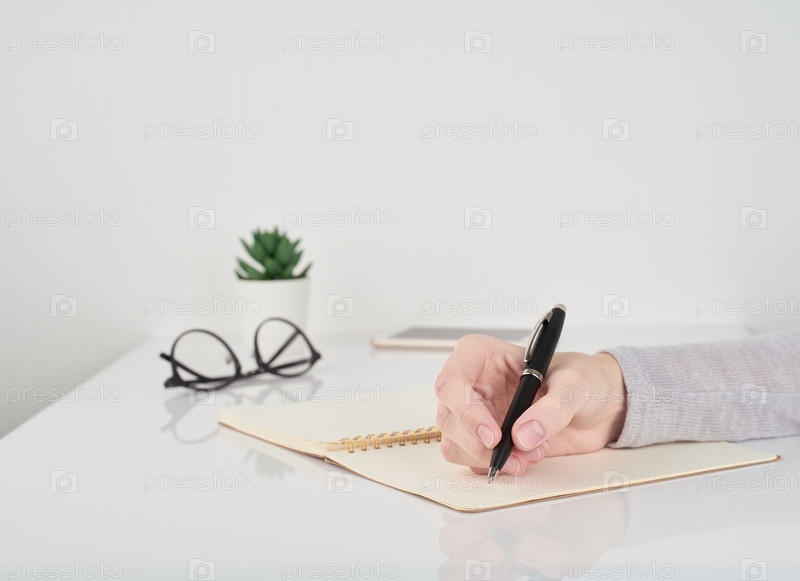 Женщина пишет в блокноте, концепция офисной работы на фоне белой стены