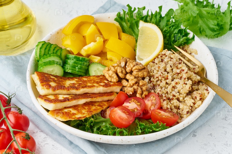Чаша Будды с халуми, киноа, салатом-латуком, вегетарианской едой, белый фон, вид сверху