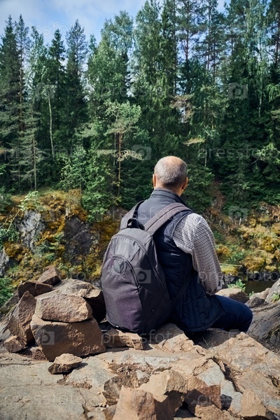 Сзади молодой человек любуется северной природой. Человек сидит на фоне скал, камней, вид сзади,