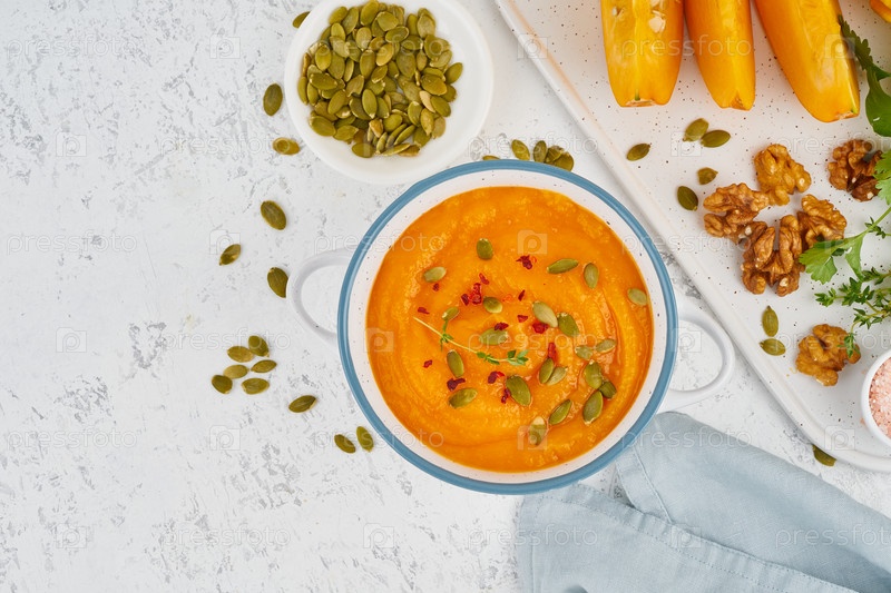 Крем-суп из тыквы с семенами, вид сверху, светлый белый фон, копия пространства