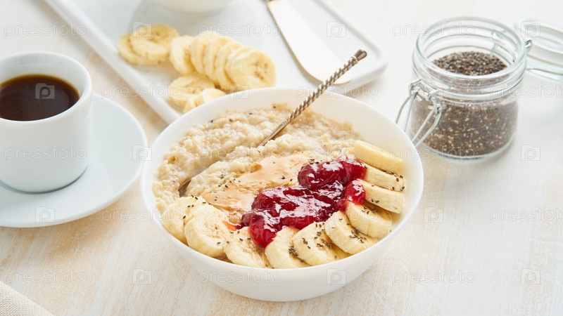 Крупный план овсяной каши, здорового веганского диетического завтрака с клубничным джемом
