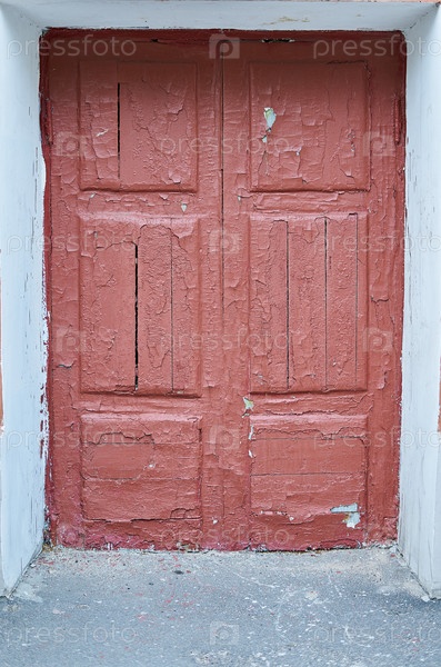 Старая треснувшая красная дверь на фасаде дома