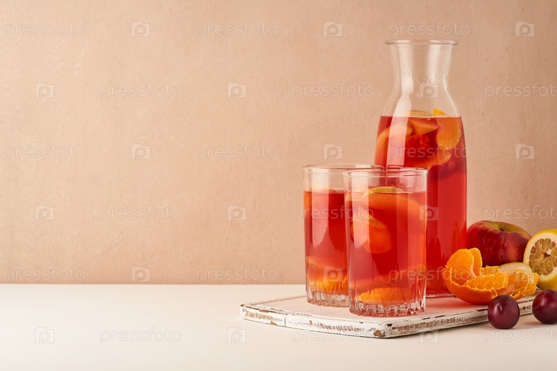 Компот из фруктов в стеклянной трубке на пастельном фоне, вид сбоку, пространство для копирования
