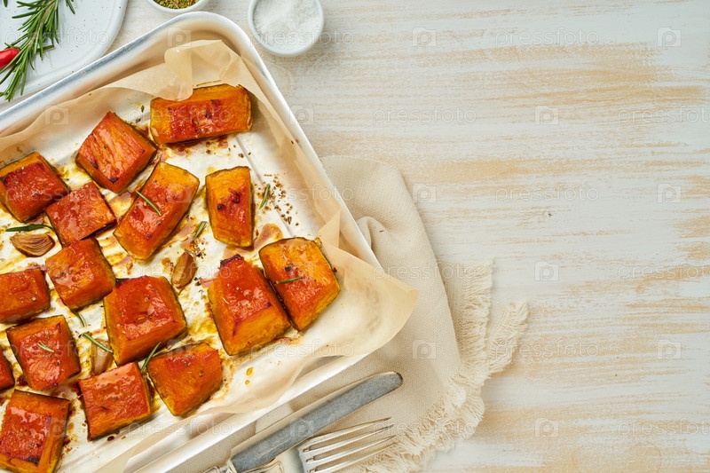 Поднос с жареными кусочками сладкой тыквы с медом и приправами, вид сверху