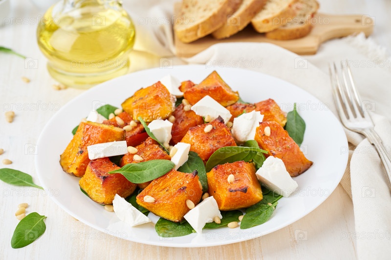 Салат с запеченной тыквой, сыром фета, шпинатом, орехами с медом и приправами, вид сбоку