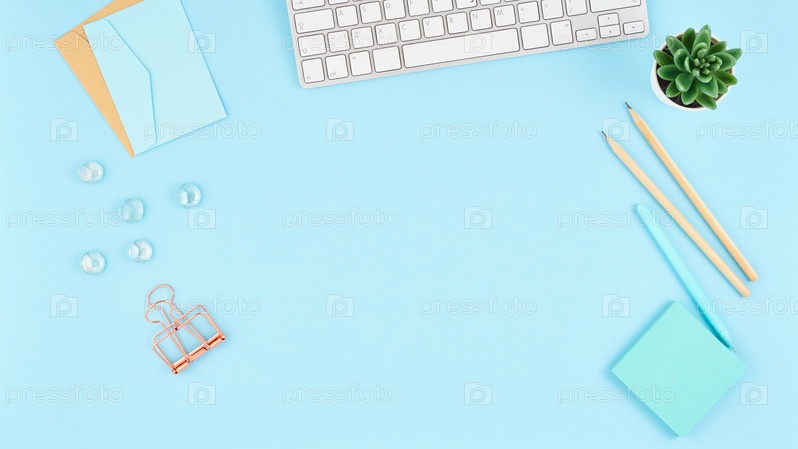 Баннер синий офисный стол. Вид сверху на современный яркий стол с канцелярскими принадлежностями