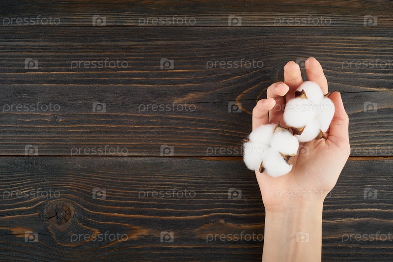 Женщина держит в руке цветы хлопка на темном деревянном фоне вид сверху копия пространства