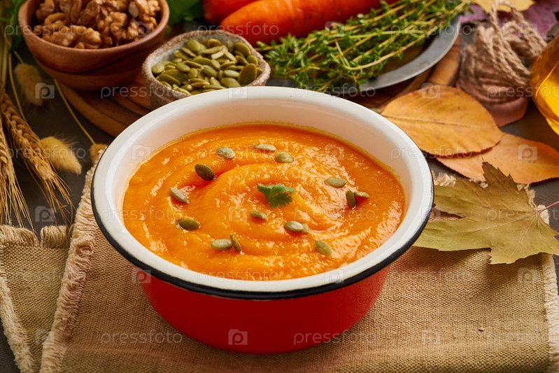 Крем-суп из тыквы с семенами и грецкими орехами, вид сбоку с осенними листьями для создания атмосферы