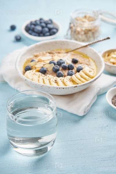 Овсянка с черникой, бананом и стаканом воды на светло-голубом фоне