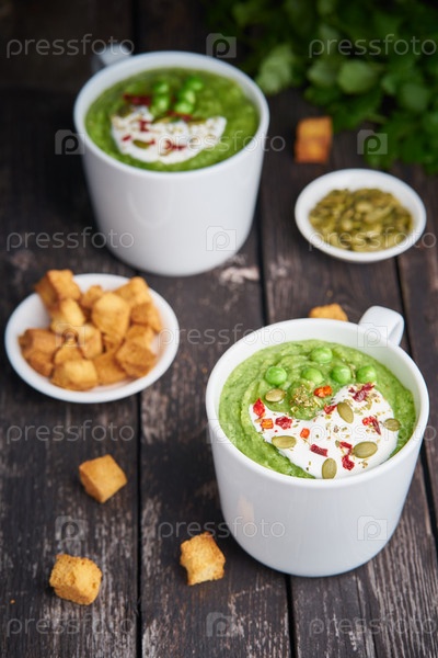 Диетический веганский суп из брокколи, цуккини, зеленого горошка на темном деревянном фоне