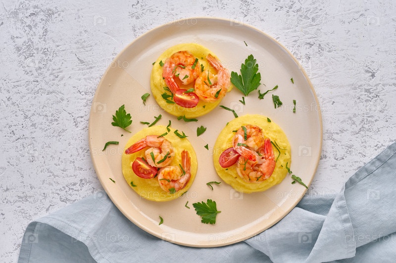 Полента с креветками - диетическое блюдо fodmap dash без глютена, вид сверху в крупном плане
