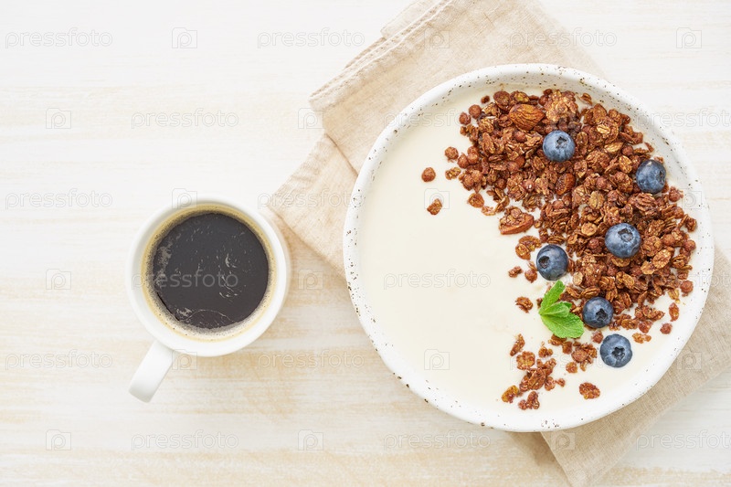 Йогурт с шоколадной гранолой, черникой. Завтрак с чашкой кофе на белом фоне
