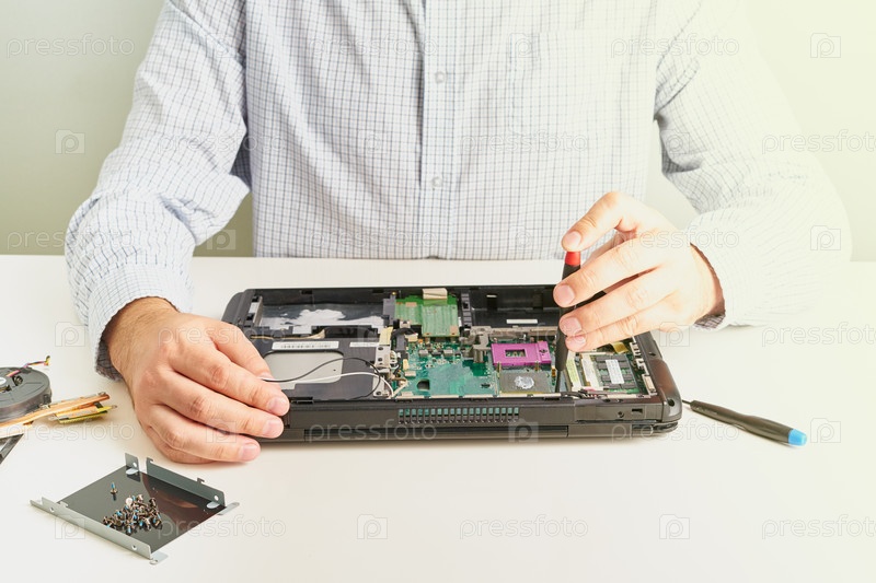 Мужчина ремонтирует компьютер. Инженер по ремонту в рубашке ремонтирует ноутбук, за белым столом у белой стены