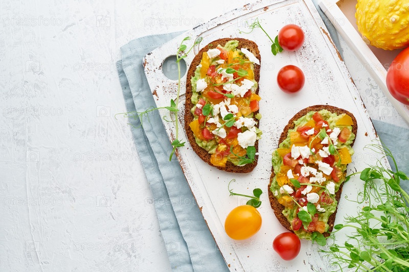 Тост с авокадо, фетой и томатами, сморреброд с рикоттой, вид сверху с местом для копирования