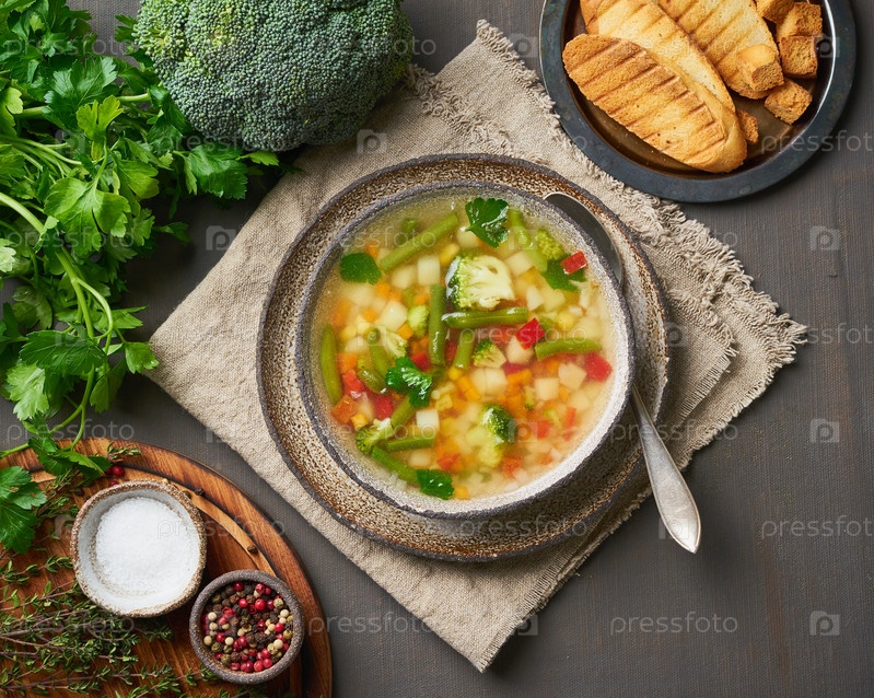 Овощной суп, диетическое вегетарианское яркое весеннее блюдо, льняная салфетка, вид сверху, коричневый темный фон