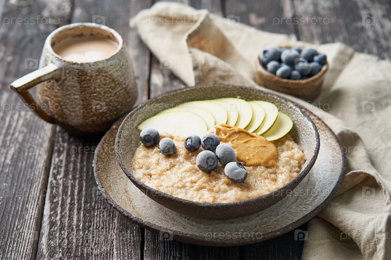 Овсянка, полезная каша в большой миске с фруктами и ягодами на завтрак