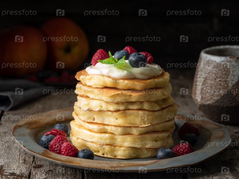 Блин с ванильным кремом, черникой и малиной. Вид сбоку, макро, крупный план. Темный мрачный старый деревенский деревянный фон