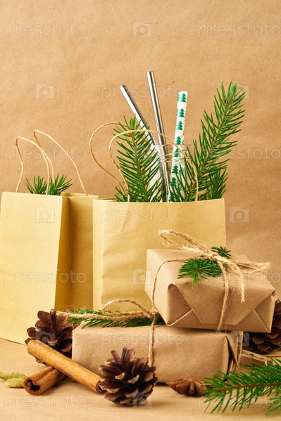 Рождество и Новый год фон из крафтовой бумаги без отходов. Подарочная рождественская коробка ручной работы, еловые ветки, многоразовая солома, вид сбоку, место для копирования. Экологичная концепция без пластика