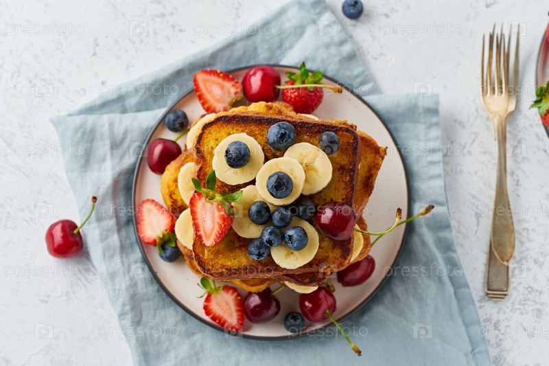 Французские тосты с ягодами и бананом, бриошь на завтрак, белый фон, вид сверху