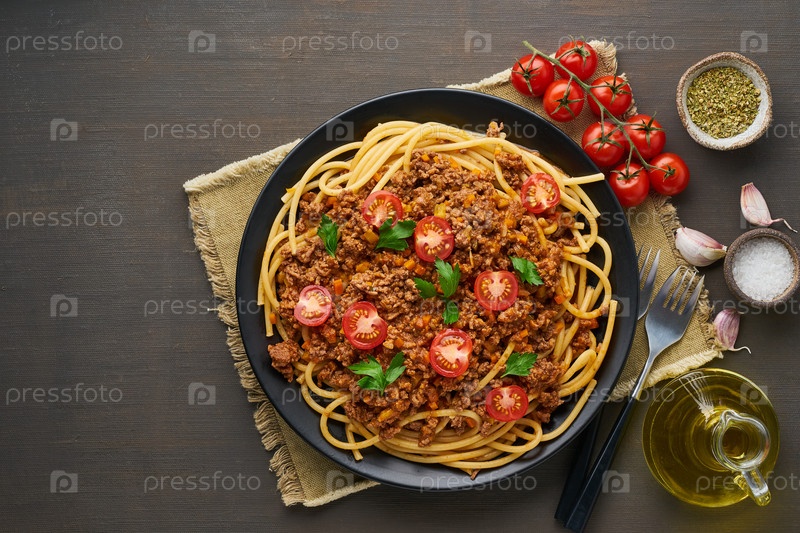 Паста Болоньезе букатини с мясным фаршем и томатами, темный деревянный фон, вид сверху, место для копирования