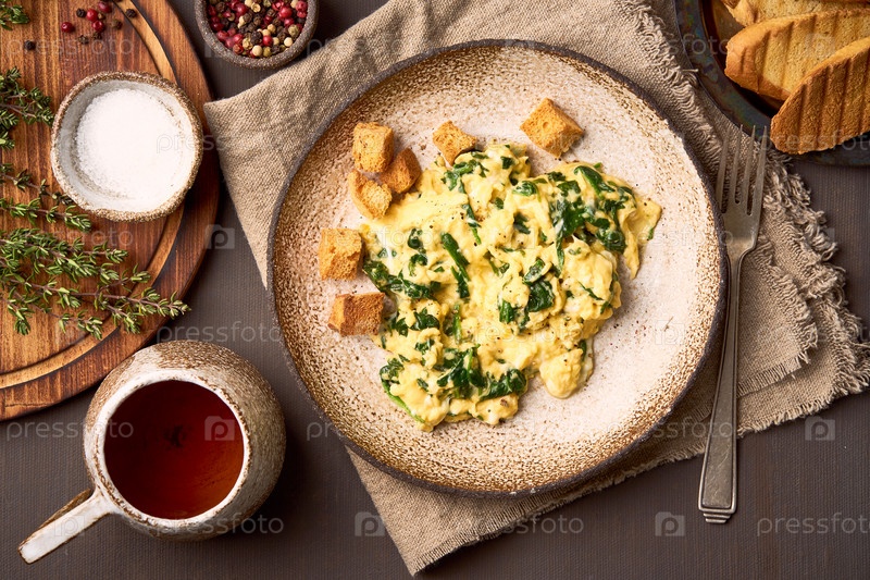 Жареные яйца и шпинат, чашка чая на темно-коричневом фоне. Завтрак с омлетом, вид сверху