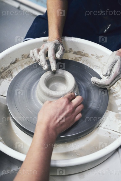 Женщина делает керамическую посуду на круге, руки крупным планом. Концепция для женщины в фрилансе