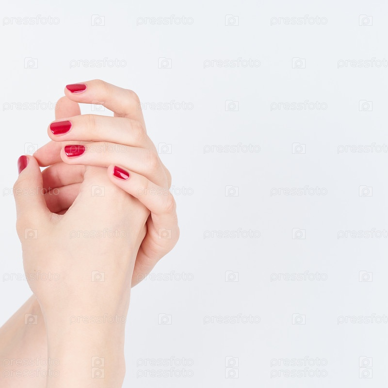 Молодые женские руки с красивым красным лаком для ногтей с глянцевым блеском, уход за кожей рук, спа-терапия для женщин, копировальное пространство на белом фоне