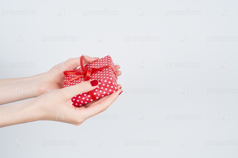 Красивая женщина держит красный подарок с лентой, руки с красным лаком для ногтей, блеск, концепция на белом фоне, копировальное пространство