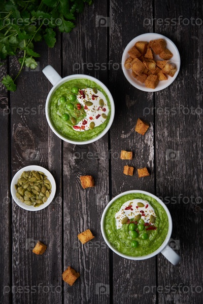 Крем-суп из брокколи на темном деревянном фоне, вертикальный, копия пространства, вид сверху. Овощное зеленое пюре в двух больших белых чашках. Диетический веганский суп из брокколи, цуккини, зеленого горошка