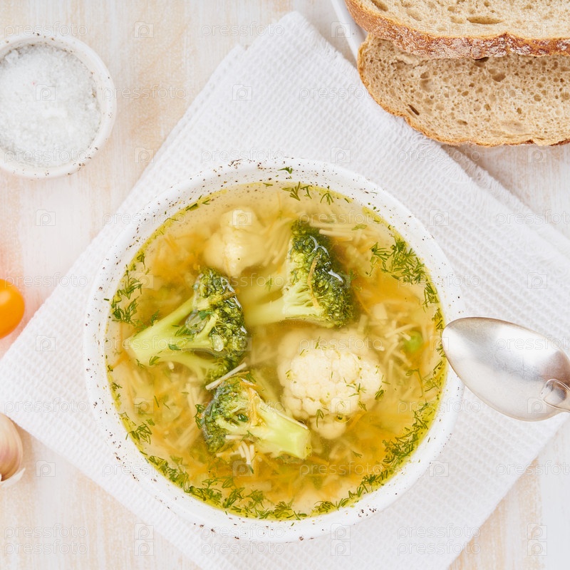 Суп из брокколи, полезное весеннее овощное диетическое вегетарианское блюдо, вид сверху, крупный план, вид сверху