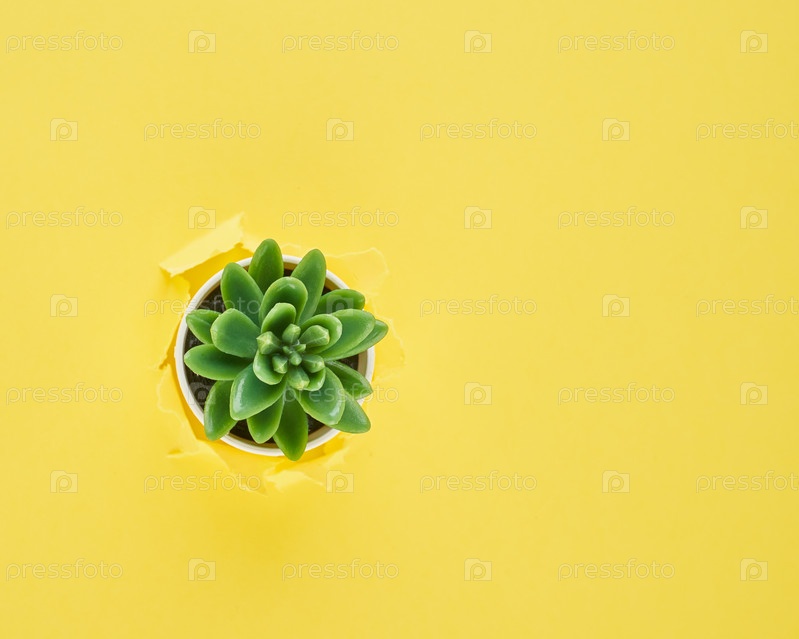 Разорванная дыра на желтом текстурированном фоне, цветочный горшок кактуса, концепция разорванной бумаги с пространством для копирования. Длинный боковой баннер. Плоская планировка