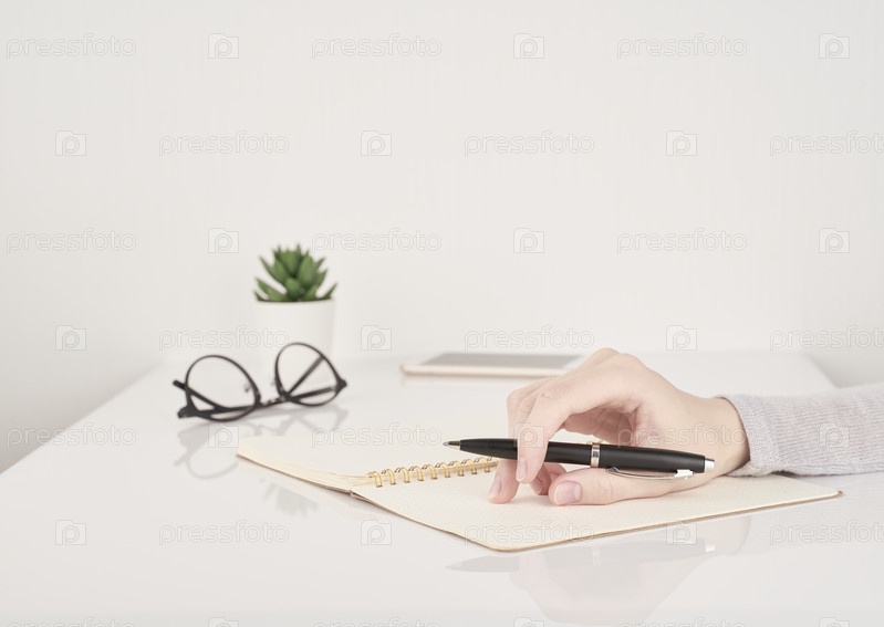 Женская молодая рука держит ручку и пишет на странице блокнота на белом и сером фоне вид сбоку пространство для копирования