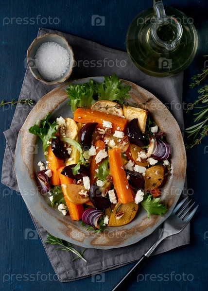 Вегетарианский салат сыр рикотта, запеченные жареные овощи, кето-кетогенная диета. Смесь морковь, свеклы, репчатая капуста, брюки, лук и орехи. Чистое питание. Вертикально