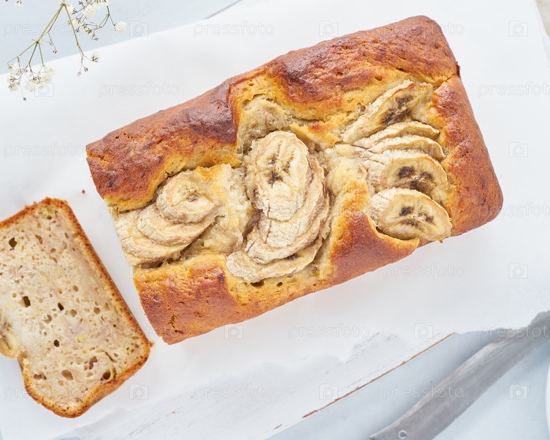 Банановый хлеб. Пирог с бананом. Вид сверху. Утренний завтрак на светло-сером фоне