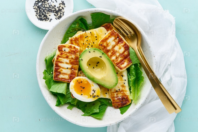 Кето-кетогенная диета яйца всмятку с авокадо и салатом на пастельном фоне крупным планом вид сверху