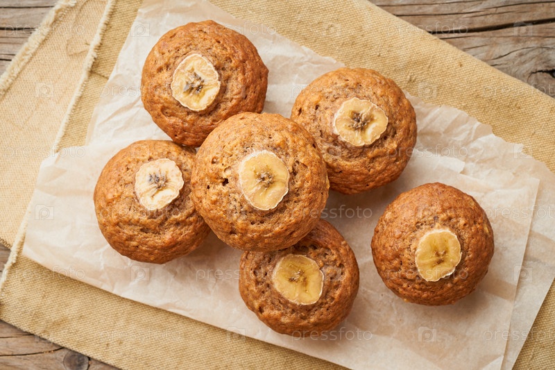 Банановый кекс, вид сверху. Кексы на старой льняной салфетке, деревенский деревянный стол, завтрак с тортом