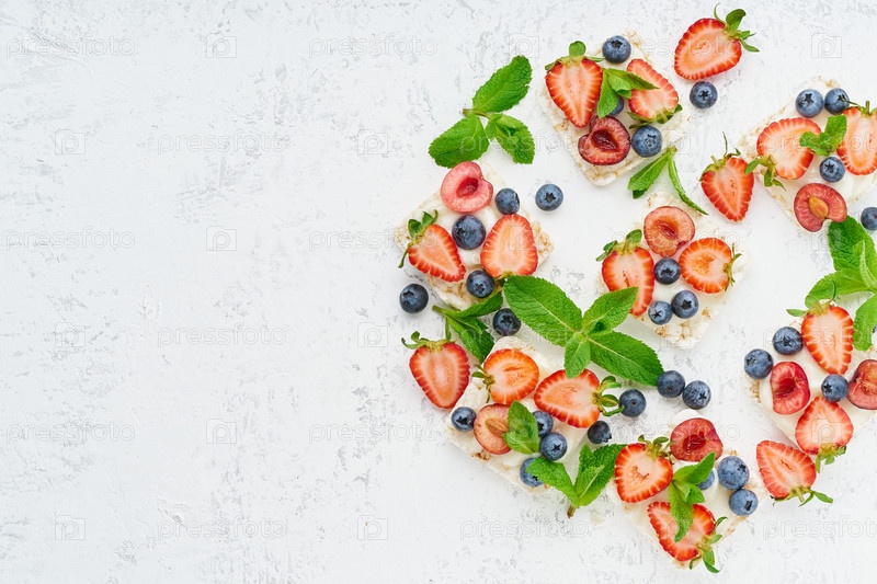 Хрустящие бутерброды Rise с ягодами и фруктами, красочная концепция на пастельном фоне, вид сверху