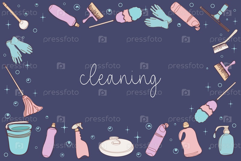 Фон оборудования для уборки. Векторная иллюстрация изолирована на синем фоне. Инструменты для уборки в одну линию