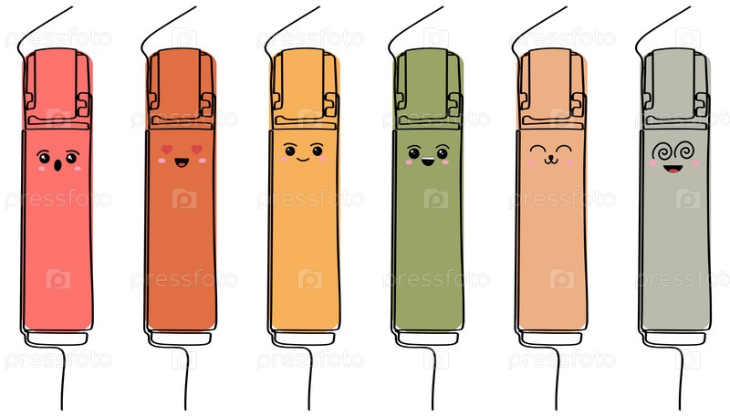 Набор красочных маркеров в стиле каваий. Векторная иллюстрация на белом фоне