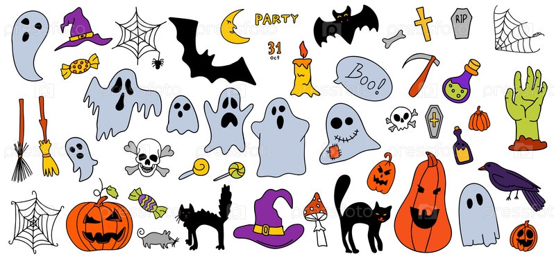 Векторный набор клипартов для хэллоуинских рисованных каракулей и гравюр. Забавная, милая иллюстрация для сезонного дизайна, текстиля, оформления детской игровой комнаты или поздравительной открытки