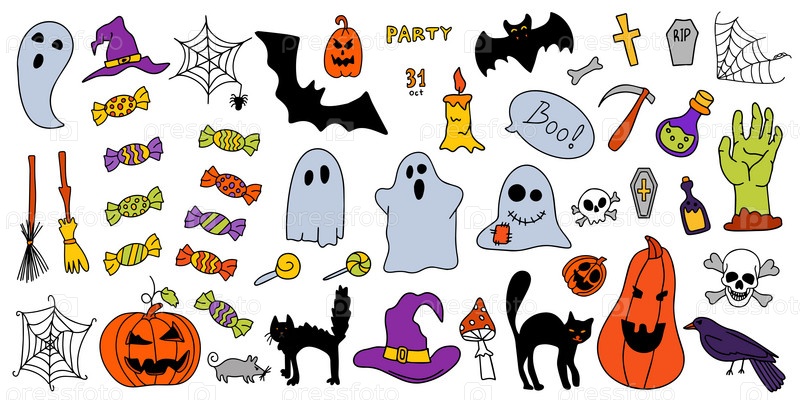 Векторный набор клипартов для хэллоуинских рисованных каракулей и гравюр. Забавная, милая иллюстрация для сезонного дизайна, текстиля, оформления детской игровой комнаты или поздравительной открытки
