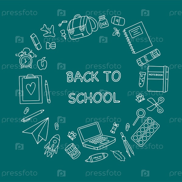 Набор нарисованных канцелярских рисунков. Концепция 'Назад в школу'. Школьные принадлежности в стиле doodle. Векторная иллюстрация