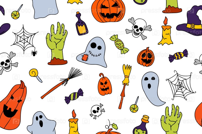 Милый бесшовный рисунок на Хэллоуин с паутиной, призраками и тыквами. милый дизайн doodle. комплект фонариков Джека. забавный нарисованный doodle, текстильный графический дизайн. обои, оберточная бумага, фон